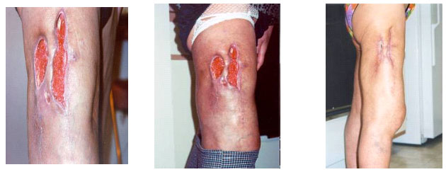 Все было хорошо до того момента, как вдруг я вся пожелтела, и два огромных шва на моей правой ноге в области бедра разошлись (10 лет спустя после аварии — в 2003 году). Врачи так и не установили причину случившегося. После длительного пребывания в больнице и приема огромного количества лекарств меня выписали с открытыми ранами на ноге. Смотреть было страшно. Были видны все мышцы в ранах, размер которых составлял примерно 10–15 см в длину и 3–6 см в ширину. В верхних и нижних отделах ран были глубокие «карманы» (примерно 1,5 см). Врачи практически отказались меня лечить, выписав большое количество наркотических таблеток. Мне сказали, что ампутация ноги неизбежна. Находясь в такой ситуации, я случайно услышала через моих знакомых о лечении трофических язв методом Дины Ашбах. Поначалу я не верила, что мне что-то поможет, но ампутировать ногу я была не готова. Так началось мое лечение растворами Ашбах. Результат стал проявляться к концу 1-й недели: цвет раны изменился (от темно-синего до ярко-красного), раны стали потихоньку стягиваться. Полностью рана закрылась к концу 2-го месяца лечения. В больницу я больше не ходила