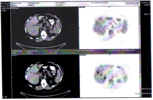 На снимке вы видите метастазы в печени (нижний снимок), которые исчезли после лечения.( верхний снимок)
