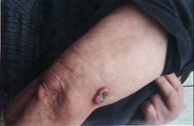 Базалиомы 2 штуки на руке. От лечения методом «Ашбах» появились рядом (как бы цветочком) ещё 2 базалиомы. Больная говорила, что тянет с локтя и с плечевого сустава. Выходили гнойные выделения.
