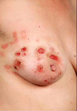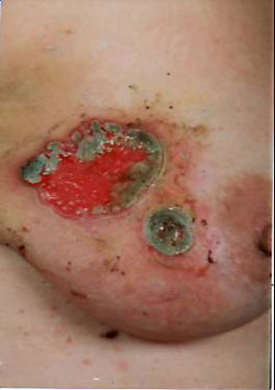 Проведена операция по удалению опухоли с резекцией 11 лимфатических узлов. Через несколько месяцев проявился рецедив: уплотнение на 4 см ниже удаленной опухоли и метастазы в костях. Опухоль гормонально-зависимая. После начала лечения опухоль «вышла» на поверхность. В дальнейшем типичное протекание лечения: изьязвление язв с последующим заживлением. Метастазы в костях остались, однако новых очагов в течении года не появилось, наоборот наблюдается частичное обызыствление старых очагов. Больная находится на постоянном приеме фитотерапии.